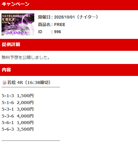 | 2025/10/01 | 若松4R【️️️️️️】 | 3連単 | 87.3倍 | 87,300円 |