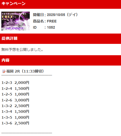 | 2025/10/05 | 福岡2R【️️️️️️】 | 3連単 | 7.1倍 | 14,200円 |