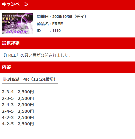 | 2025/10/09 | 浜名湖4R【️️️️️️】 | 3連単 | 10.9倍 | 27,250円 |