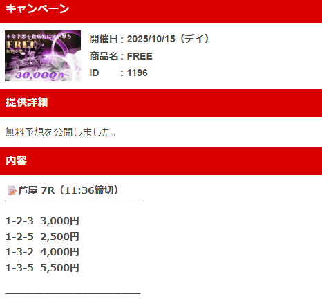 | 2025/10/15 | 芦屋7R【️️️️️️】 | 3連単 | 4.8倍 | 26,400円 |
