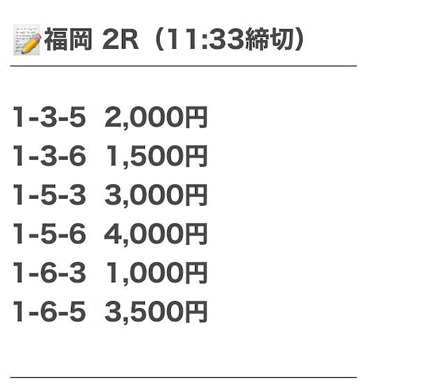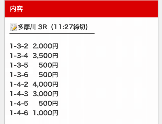 無料予想を含めて、ここまでの参加結果から見解予想は必要ないと思うので、買い目と購入金額からご覧いただこう。